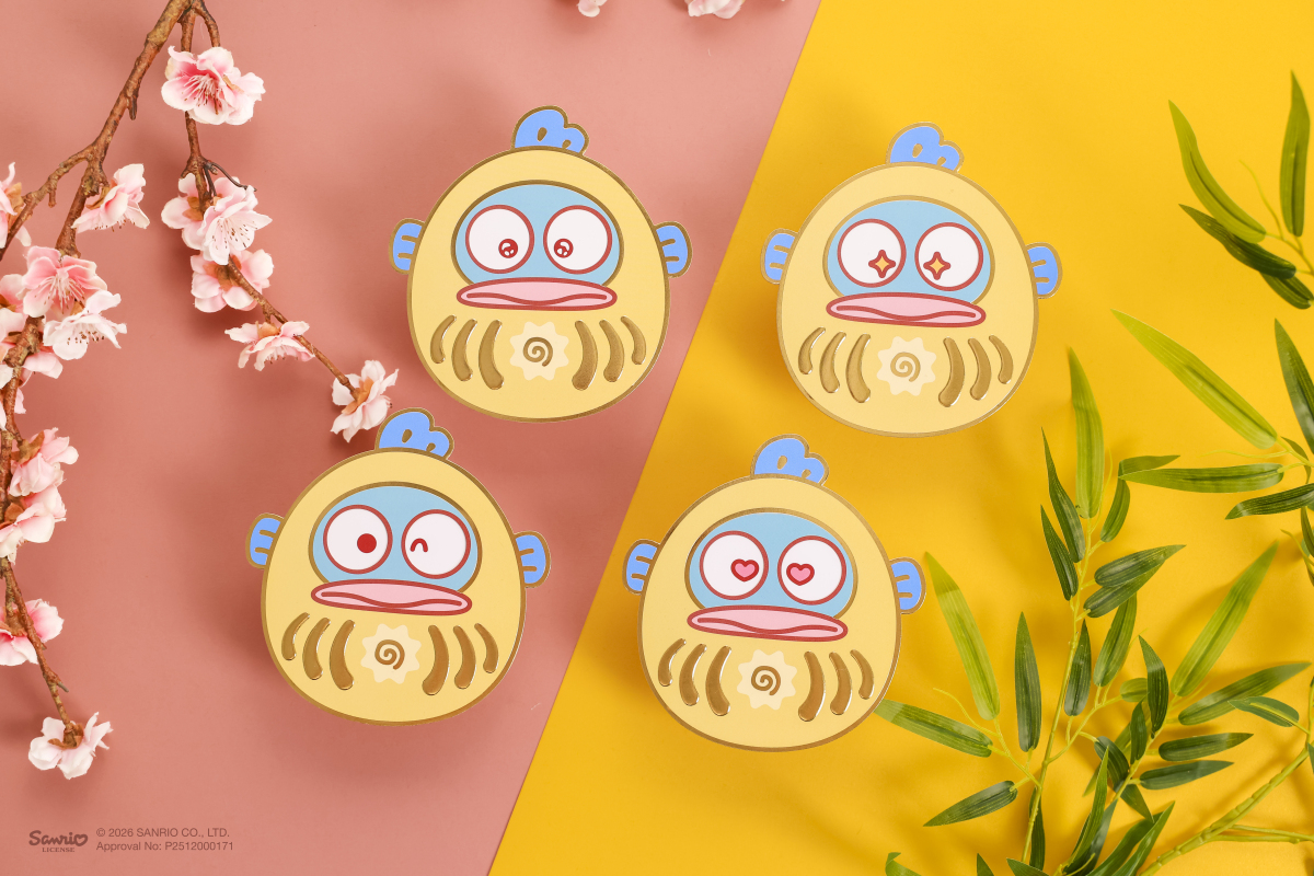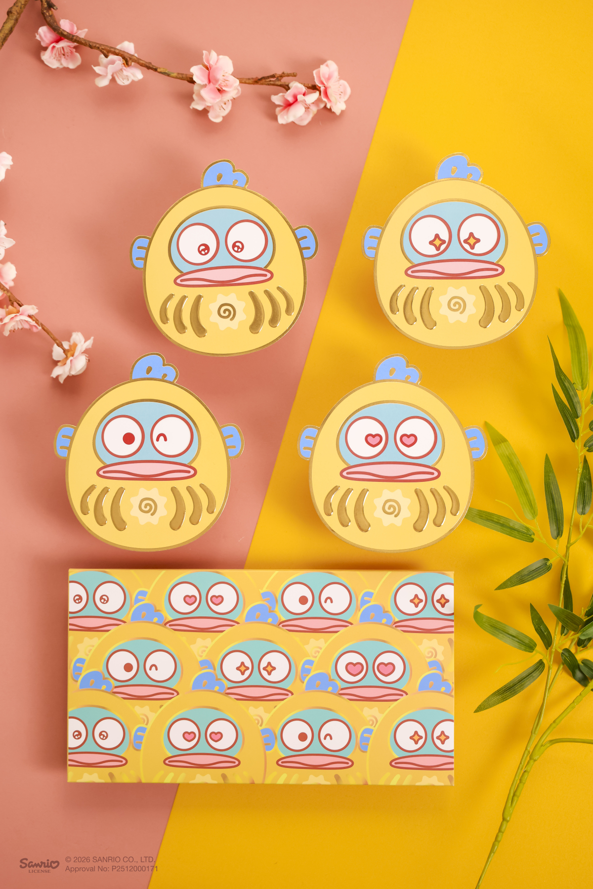 「風生『水』起尊貴賀年套裝」中HANGYODON以耀眼奪目金色達摩造型亮相,寓意水頭充足、財運亨通、步步高陞。而每個HANGYODON金色達摩造型利是封更附有「HANGYODON新春祝福眼神小卡」,可以隨意為HANGYODON變換4款趣緻眼神,玩味滿分!每款眼神都蘊含不同的新春祝願:「愛心眼」象徵愛心滿溢、心想事成;「亮晶晶眼」代表滿心幸福、溫馨洋溢;「醒目wink眼」展現精靈活潑、聰明伶俐;而「閃閃星星眼」則寓意吉星高照、順風順水,由派發者親手換上更顯心意誠摯,收禮者願望必達!