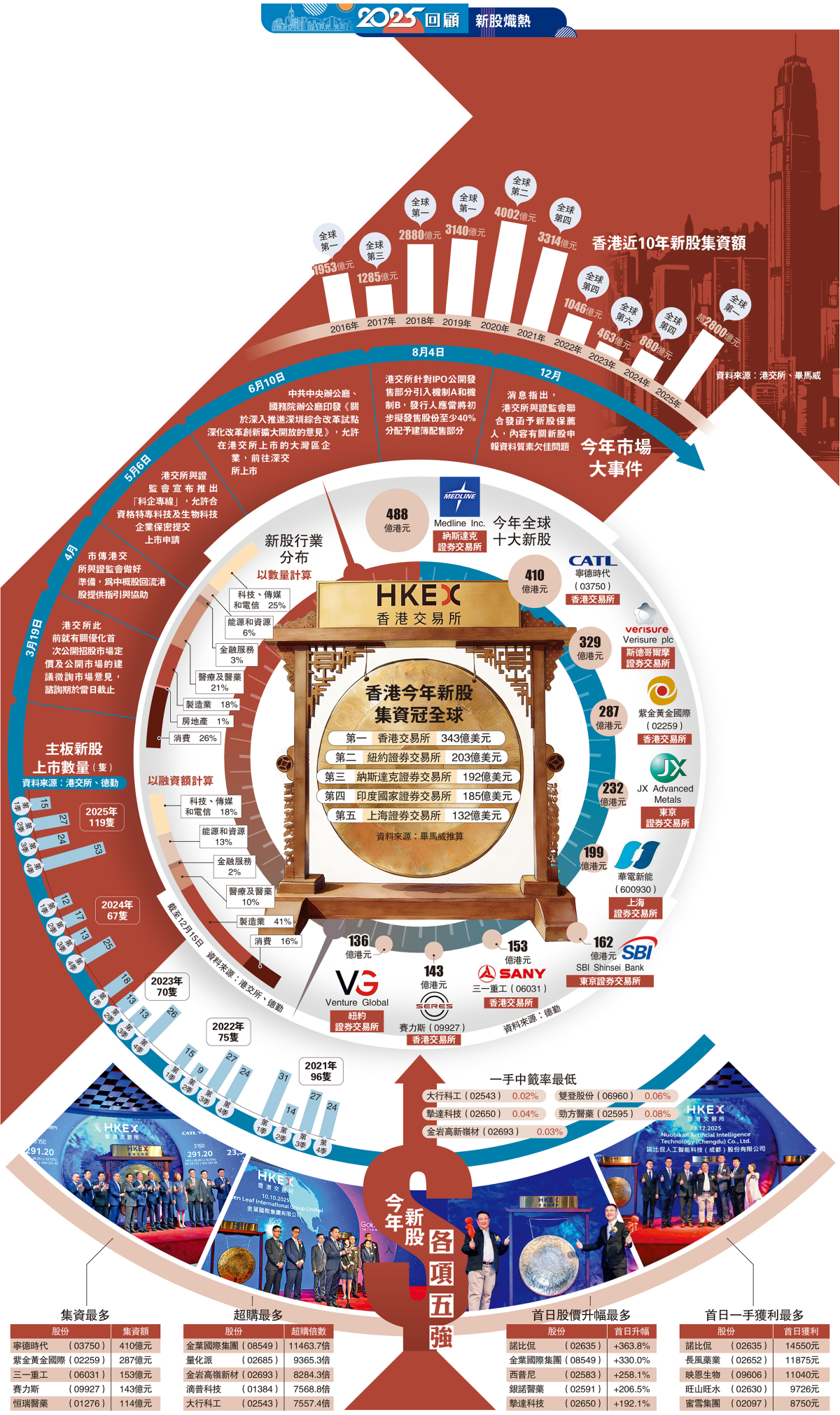 【點新聞報道】時隔6年,香港再度登頂成為全球新股集資額榜首。據港交所(00388)統計,截至12月30日,今年共有119家公司在港上市,集資額超過2800億元,其中四家公司更躋身2025年全球十大新股之列。業界對後市樂觀,看好赴港上市活動持續踴躍,2026年有望吸引大型公司在港IPO,集資額可進一步增加到3200億至3500億元,繼續蟬聯全球第一寶座。