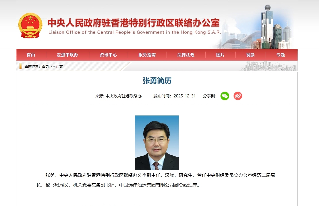 公開信息顯示,張勇,男,漢族,中共黨員,對外經濟貿易大學國際法專業法學博士。張勇曾任中央財經委員會辦公室經濟二局局長、秘書局局長、機關黨委常務副書記,中國遠洋海運集團有限公司副總經理。2025年12月,張勇任中央人民政府駐香港特別行政區聯絡辦公室副主任。
