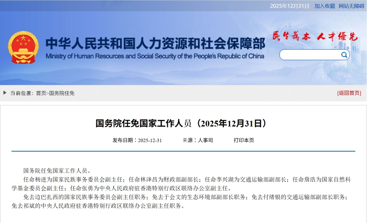 【點新聞報道】據人社部網站12月31日消息,國務院任免國家工作人員。任命楊進為國家民族事務委員會副主任;任命林澤昌為財政部副部長;任命李興湖為交通運輸部副部長;任命詹浩為國家自然科學基金委員會副主任;任命張勇為中央人民政府駐香港特別行政區聯絡辦公室副主任。