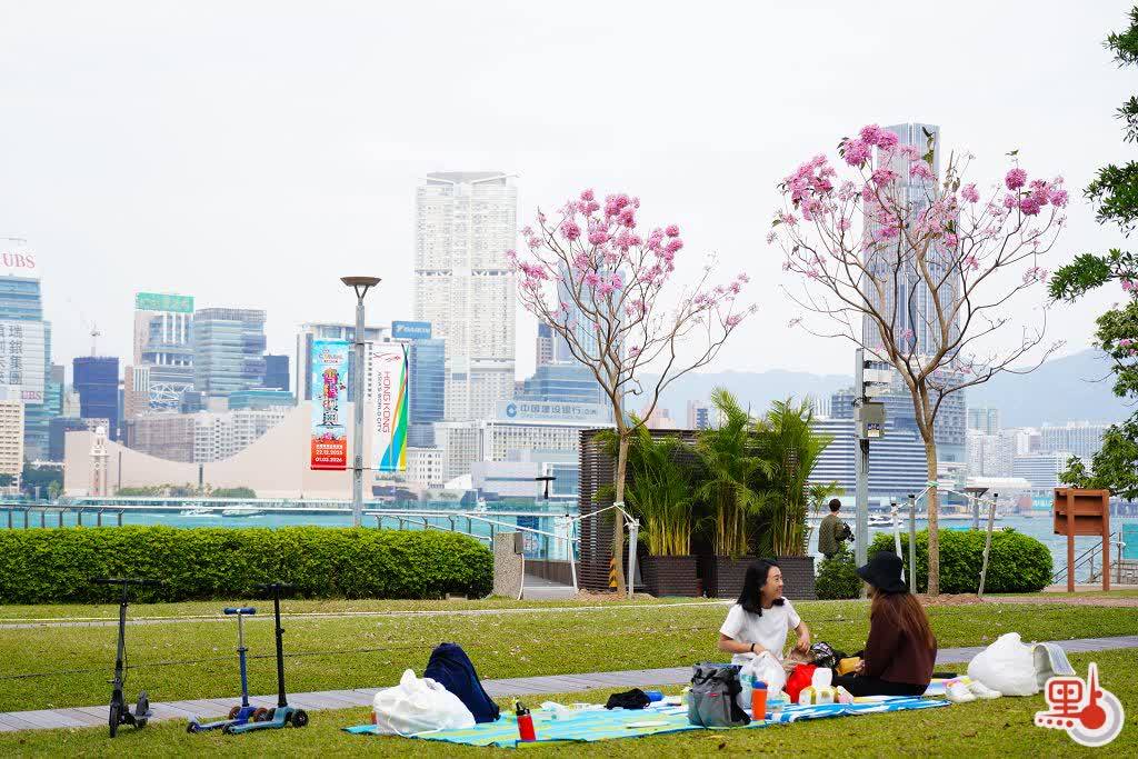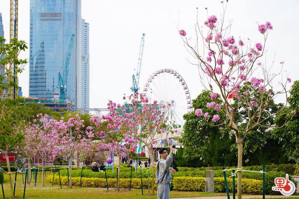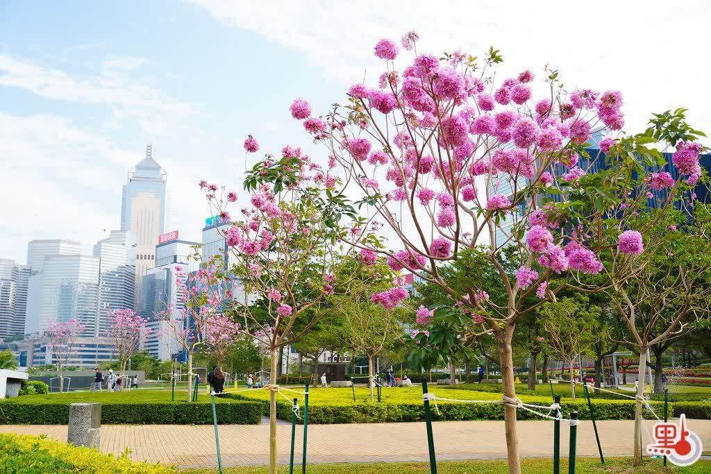 添馬公園的紫花風鈴木園,種植約有80棵紫花風鈴木及約1000棵簕杜鵑,打造色彩繽紛的觀賞區,與中環海濱形成協同效應。如今添馬公園的紫花風鈴木已然盛開,形成大片粉紫花海,伴隨維港美景,成為香港一抹獨特的風景。