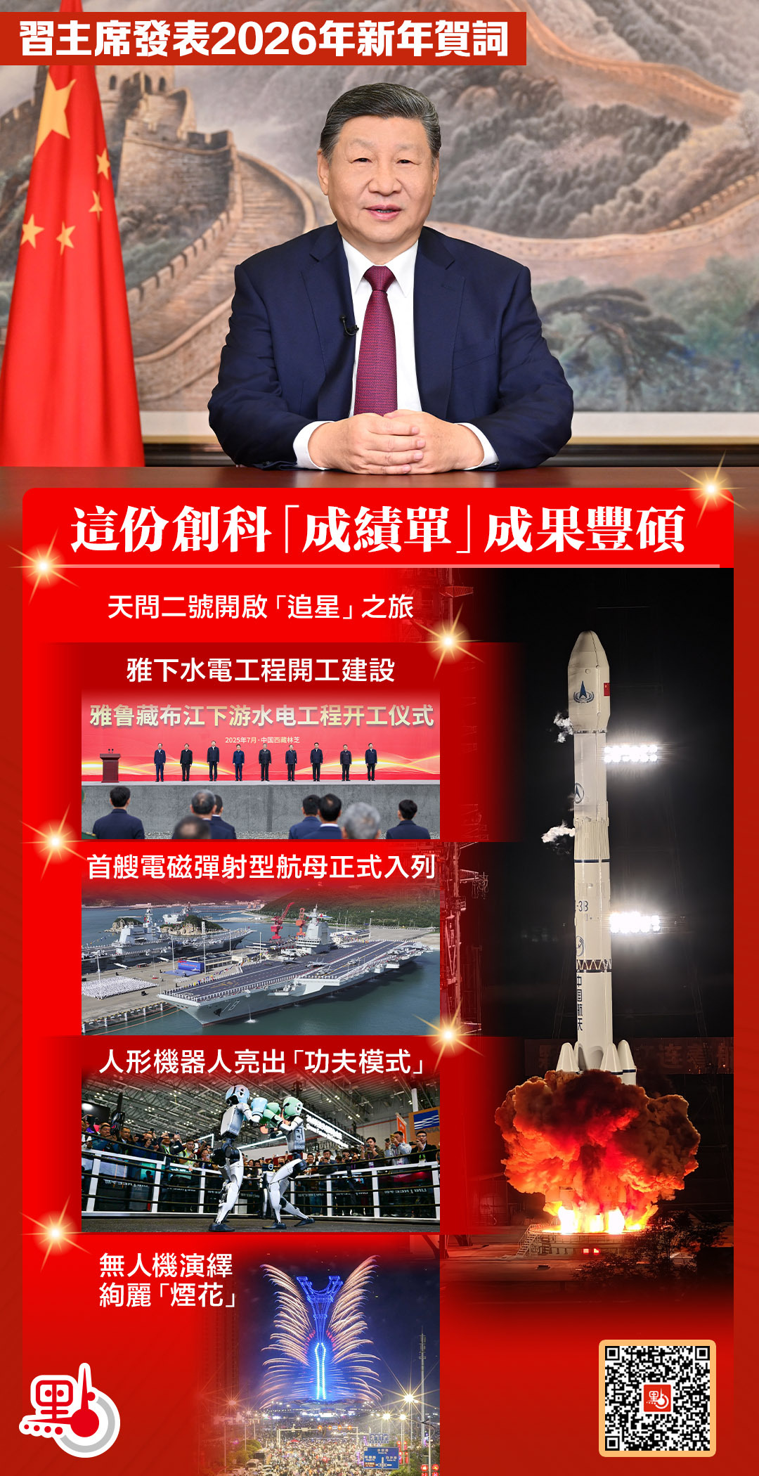 習近平提到:「天問二號開啟『追星』之旅,雅下水電工程開工建設,首艘電磁彈射型航母正式入列。人形機器人亮出『功夫模式』,無人機演繹絢麗『煙花』。創新創造催生了新質生產力,也讓生活更加多姿多彩。」