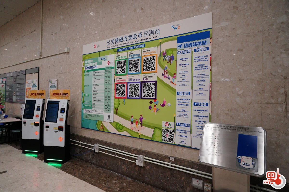 在旺角廣華醫院,已有不少新收費的宣傳字句,亦有易拉架講述新收費基本資料。醫院管理局主席范鴻齡、醫管局行政總裁李夏茵,以及廣華醫院急症科部門主管陳東寧到場視察。