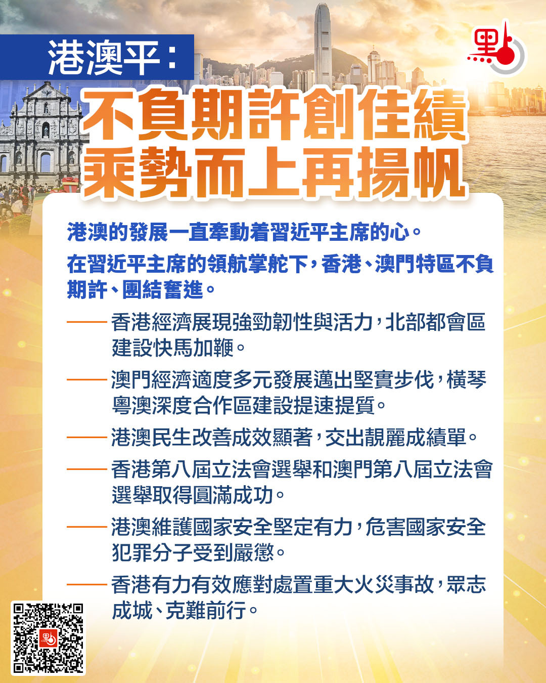 我們相信,新的一年,在中央政府和祖國內地的全力支持下,香港、澳門特區政府必將團結帶領社會各界主動對接「十五五」規劃,充分發揮港澳獨特優勢和重要作用,更好融入和服務國家發展大局,在以中國式現代化全面推進強國建設、民族復興偉業的壯闊征程中實現更好發展、作出更大貢獻!