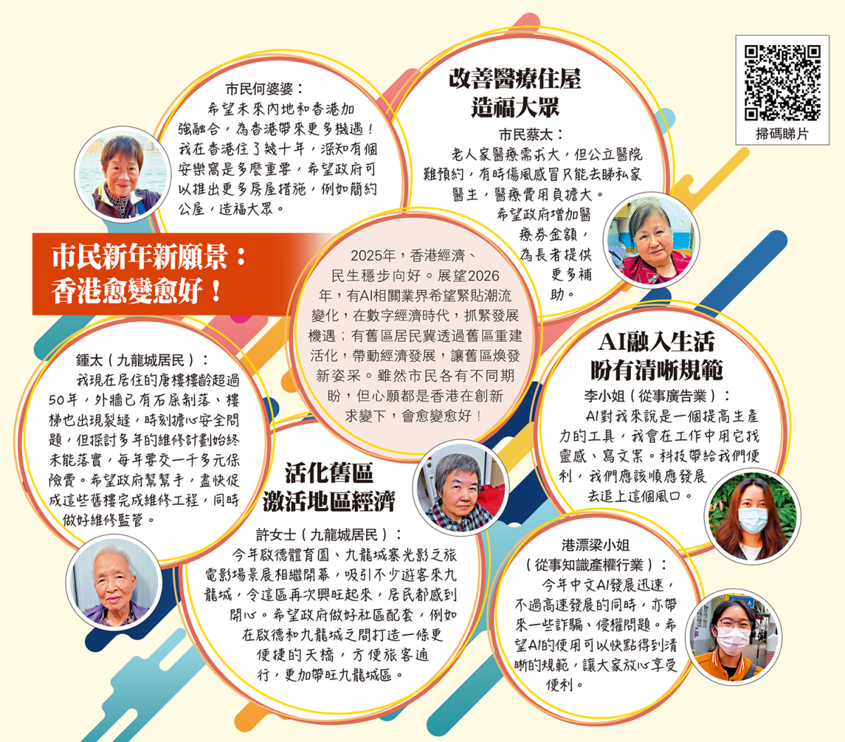 2025年,香港經濟、民生穩步向好。展望2026年,有AI相關業界希望緊貼潮流變化,在數字經濟時代,抓緊發展機遇;有舊區居民冀透過舊區重建活化,帶動經濟發展,讓舊區煥發新姿采。雖然市民各有不同期盼,但心願都是香港在創新求變下,會愈變愈好!
