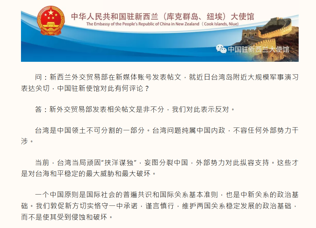 【點新聞報道】中國駐新西蘭使館發言人今日(1月1日)就新外交貿易部涉台帖文答記者問。記者提問指,新西蘭外交貿易部在新媒體賬號發表帖文,就近日台灣島附近大規模軍事演習表達關切,中國駐新使館對此有何評論?