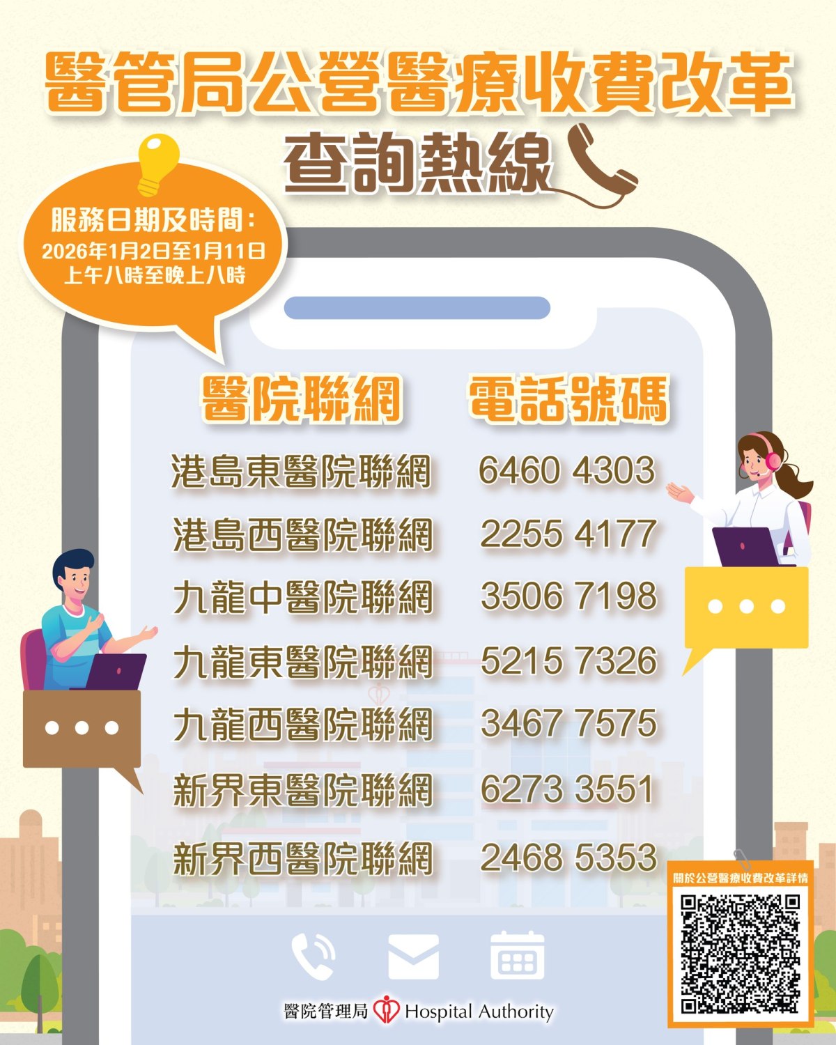 醫管局表示,為了幫助市民更清楚了解收費改革的新措施,各公立醫院除了已加派人手,包括服務大使、專隊職員及義工等,在醫院不同範圍解答病人查詢外,各醫院聯網亦設立查詢熱線,供病人查詢收費改革的各項安排。