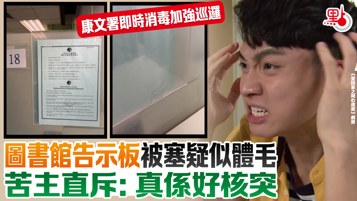 【點新聞報道】圖書館驚現嘔心一幕!近日一名男網民在南葵涌公共圖書館自修室內,竟發現告示板被塞入大量「疑似人體體毛」,直斥「真係好核突」。康文署證實事件,並已即時採取行動進行清潔消毒。