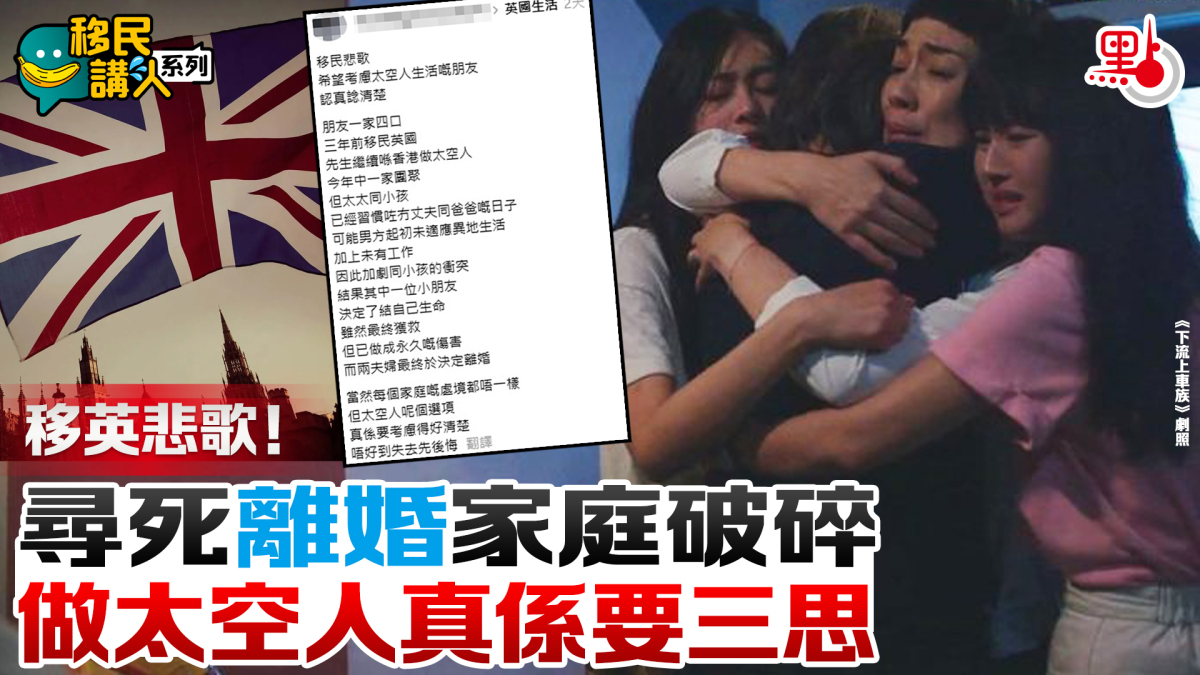 【點新聞報道】移民的巨變,令不少家庭變成了破碎家庭。有移民英國的港人發文分享,一個移英「太空人」家庭的不幸經歷,指獨自留港三年賺錢的港爸,過到英國一家團聚後,卻發現生活已變調,「太太同小孩,已經習慣咗冇丈夫同爸爸嘅日子」,結果衝突頻生,其中一名小孩更尋死,雖最終獲救,但一家人已回不去,最終兩夫婦落得離婚收場。
