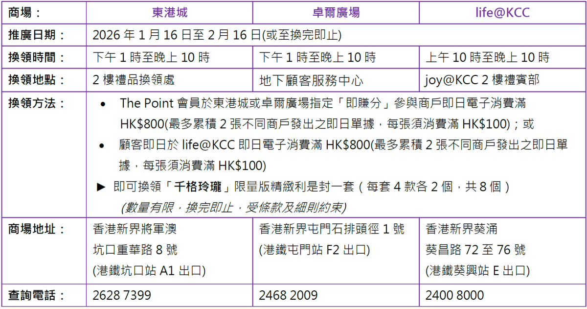 【點新聞報道】踏入2026年,農曆新年的腳步還會遠嗎?快來齊齊睇新春佳節的各種好去處:東港城/卓爾廣場/life@KCC聯合呈現「千格玲瓏」限量版精緻利是封,4款流光溢彩的利是封傳遞美好祝福;更有潮玩展讓你在眾多熱門潮玩IP中度過美好一年;iSQUARE更首度聯乘香港插畫家品牌oh…little sweet變身華服小湯圓,讓大家率先睇3大「圓」美打卡區域;香港星巴克首推草莓柚子康普茶,更有多款精選冬日美食伴您喜迎馬年;惠康更首次聯乘香港原創品牌「G.O.D.住好啲」推出限量版「堅好運水晶麻雀套裝」及「新春開運遊戲套裝」,歡迎選購;新鴻基帶來六種春日色彩利是封,御守造型和手織平安結盡顯新春雅韻。一齊來睇睇!