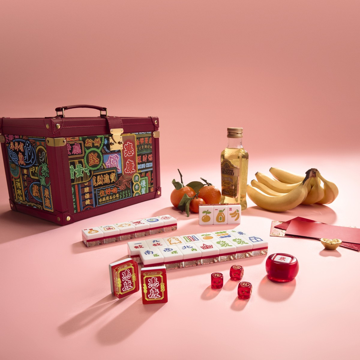 「堅好運水晶麻雀套裝」全副共有144隻水晶麻雀,每一顆皆內嵌超市賀年元素,例如象徵「大吉大利」的柑橘、寓意「招財進寶」的香蕉、「年年有餘」的常滿米缸等,這些充滿日常生活氣息的圖案,讓「辦年貨」的溫馨場景躍然牌上。「新春開運遊戲套裝」重新詮釋傳統的魚蝦蟹遊戲,打造趣味「惠康超市版」賀年遊戲!設計以活潑的手繪線條,配合超市常見的食材與日用品巧妙轉化為遊戲圖案,如象徵吉祥的柑橘、寓意富足的油和米、團圓的全盒以及購物車、油雞等。