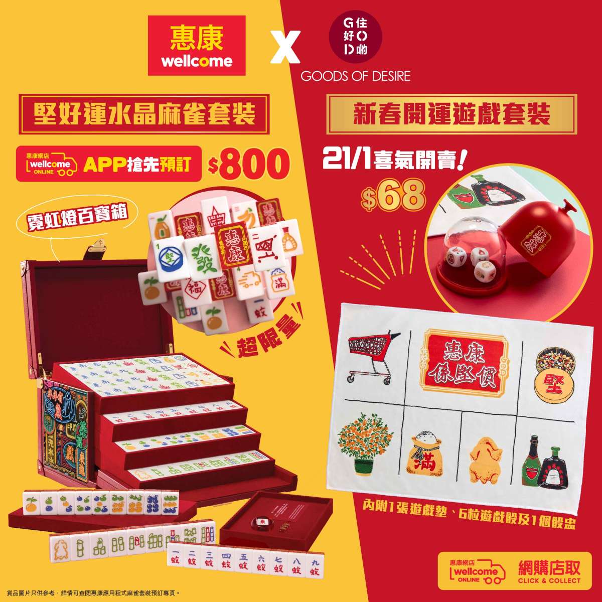 惠康首次與香港原創生活品牌「G.O.D.住好啲」聯乘,推出新年開運必備的「堅好運水晶麻雀套裝」與「新春開運遊戲套裝」,誠心祝願大家新一年「食鮮啲、住好啲」,豐衣足食,喜迎馬年!兩款賀年限量版遊戲套裝將會分階段於惠康網店應用程式預訂,網店或指定5間門市發售,而「堅好運水晶麻雀套裝」即日起率先在惠康網店應用程式開放預購,並提供送貨服務,將新年「堅好運」送到每一個家庭及為新春佳節增添濃厚氣氛!