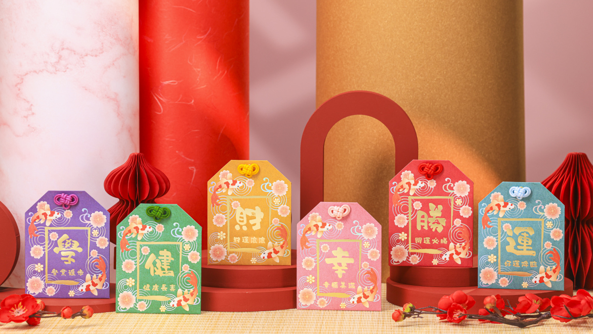 「錦鯉迎春御吉祥」利是封以六種春日色彩包括:粉紅、暖橙、天藍、雅紫、豔紅、墨綠為主調,各自配上不同祝福句:「幸福滿滿」「財運滾滾」「好運降臨」「學業進步」「開運必勝」與「健康長壽」,象徵「六六大順」的吉祥滿意。加上每款封面均有一對錦鯉悠遊,寓意新一年如魚得水、平安順遂。御守的造型更蘊含守護祝福之意,再搭配人手編織平安結,光影流轉間盡顯新春的喜慶與雅緻。
