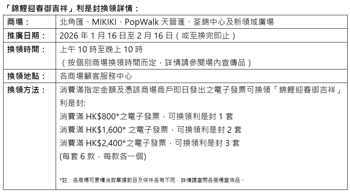為迎接丙午馬年,新鴻基地產旗下五大商場——北角匯、MIKIKI、PopWalk天晉匯、荃錦中心及新領域廣場,攜手推出限量版「錦鯉迎春御吉祥」利是封。設計以「錦鯉御守」為主題,將滿載祝福的字句刻印於六款精緻立體的利是封面上,寄寓六六大順的平安與吉祥,祝願大家新一年福澤安康。