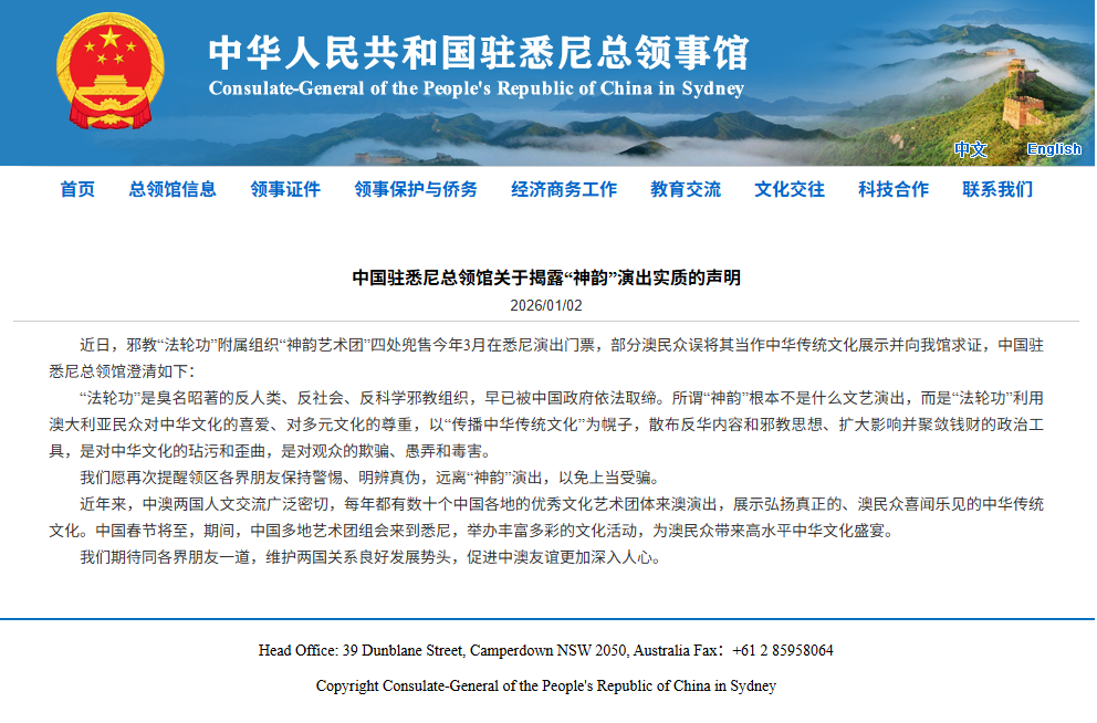 近日,邪教「法輪功」附屬組織「神韻藝術團」四處兜售今年3月在悉尼演出門票,部分澳民眾誤將其當作中華傳統文化展示並向我館求證,中國駐悉尼總領館澄清如下: