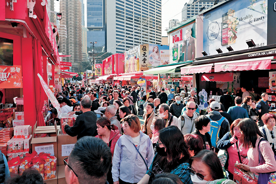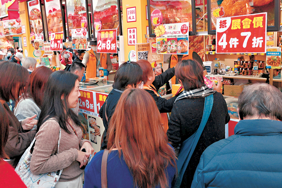 在維園舉行的香港工展會於下周一(5日)結束,香港文匯報記者昨日(2日)在工展會會場了解,發現不少內地旅客趁元旦有3天小長假來港旅遊消費並到場掃貨,加上本地居民入場購物,不少參展商均表示丁財兩旺。不少內地旅客消費約2,000元至3,000元購買各類產品,本地市民亦購買山珍海味和酒類,帶動食品、電器、保健品等多類產品熱銷,更為香港假期消費市場注入強勁經濟活力。有參展商表示,其攤位今屆展期每日客流量達600人次,銷售額也比上年多兩成至三成,貨架商品在半日內已一掃而空。