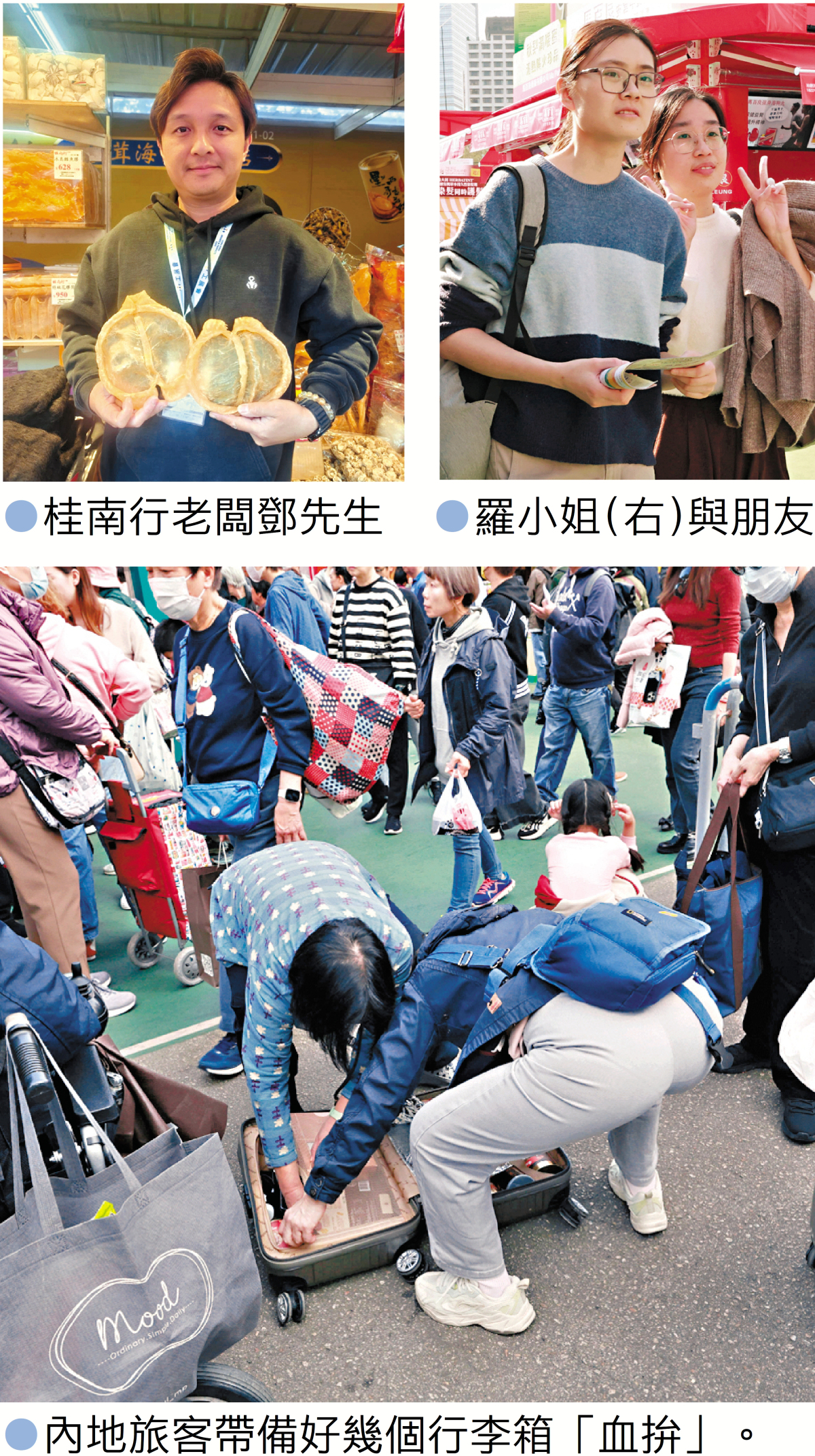 內地旅客郭女士一行帶備好幾個行李箱「血拚」,她表示是首次到工展會購物,同行者則年年參與。剛抵達會場,她已消費約1,000港元購買日本和韓國進口點心,以及本地蛋卷等產品,還買了一串魚蛋,稱口味不錯,後續計劃逛保健品,坦言想購買海參、魚膠等海味,因無法攜帶作罷,認為工展會商品種類頗多,期望有更多優惠,如增加買一送一等。