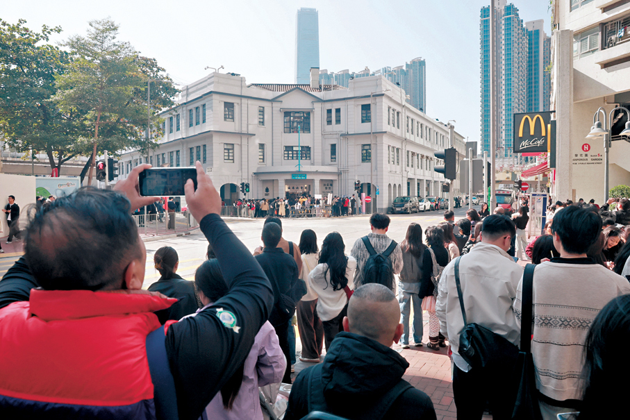 香港文匯報記者昨日在線上預約網站查詢,發現昨日至周日(2日至4日)的名額已約滿,下周一(5日)當天只剩下午5時30分之後的入場名額。記者到場直擊,發現警署門外甚至馬路對面也聚集着大批前來合影打卡的內地旅客。不少旅客到場後才發現有「油蔴地警署光影之旅」展覽,在工作人員指示下查看線上系統查詢預約情況,但頭3天參觀名額已滿額。