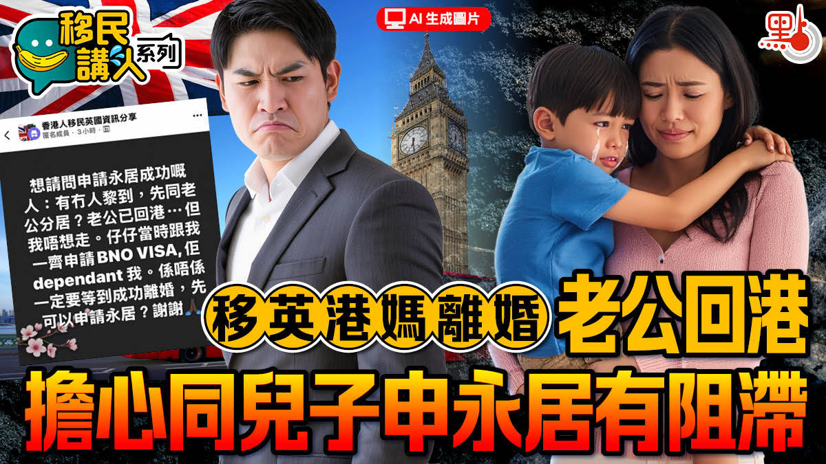【點新聞報道】不少移民家庭落得離婚收場,有移民英國的港媽表示,「老公已回港...但我唔想走」,惟擔心會因此影響到她和兒子永居的申請,遂發文尋求網民協助。