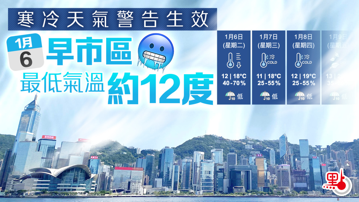 【點新聞報道】天文台今日(5日)下午4時許發出寒冷天氣警告,預測本港未來兩三日早上天氣寒冷,明早市區最低氣溫約12度,新界會再低兩三度。天文台呼籲市民注意保暖,多穿禦寒衣物,並應保持室內空氣流通。