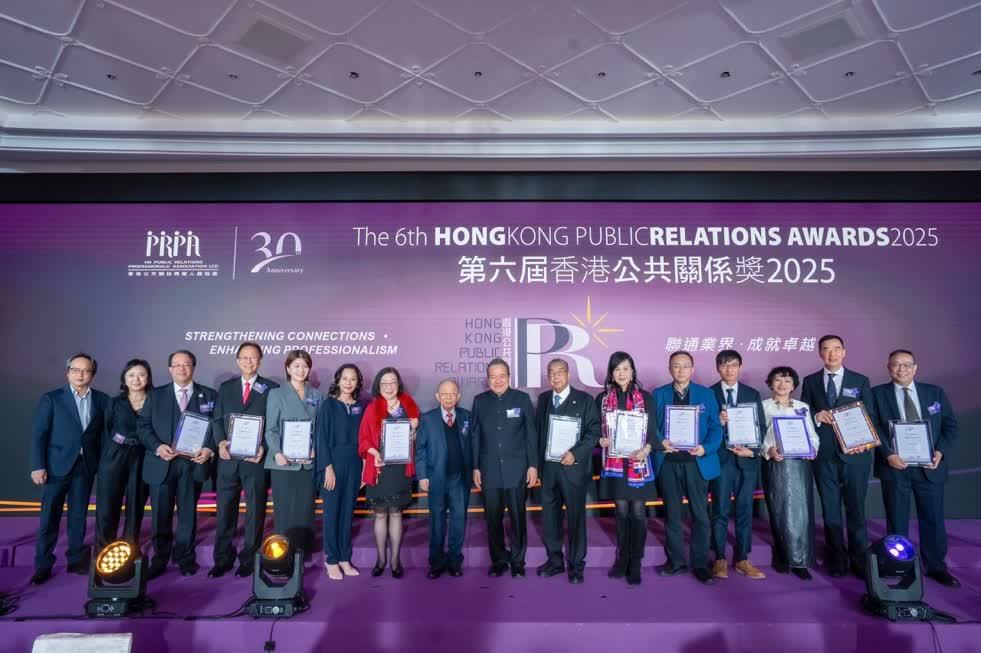 【點新聞報道】為表彰公共關係業界的傑出成就及創新精神再添里程碑,2025年12月30日,香港公共關係專業人員協會(PRPA)舉行「第六屆香港公共關係獎2025」頒獎典禮暨晚宴。今年的主題為「聯通業界 成就卓越」,共頒發32個獎項,涵蓋多個公關案例獎項類別、個人獎項、專上學生獎項及特別獎項。頒獎典禮匯聚商界、媒體、學術界及公共關係業界的翹楚,表彰於2023年4月1日至2025年3月31日期間所推出而展現卓越創意、策略、執行及成效的優秀公共關係項目。參賽個案中,30%是首次參與的機構,反映獎項日益受到行業的關注及重視。