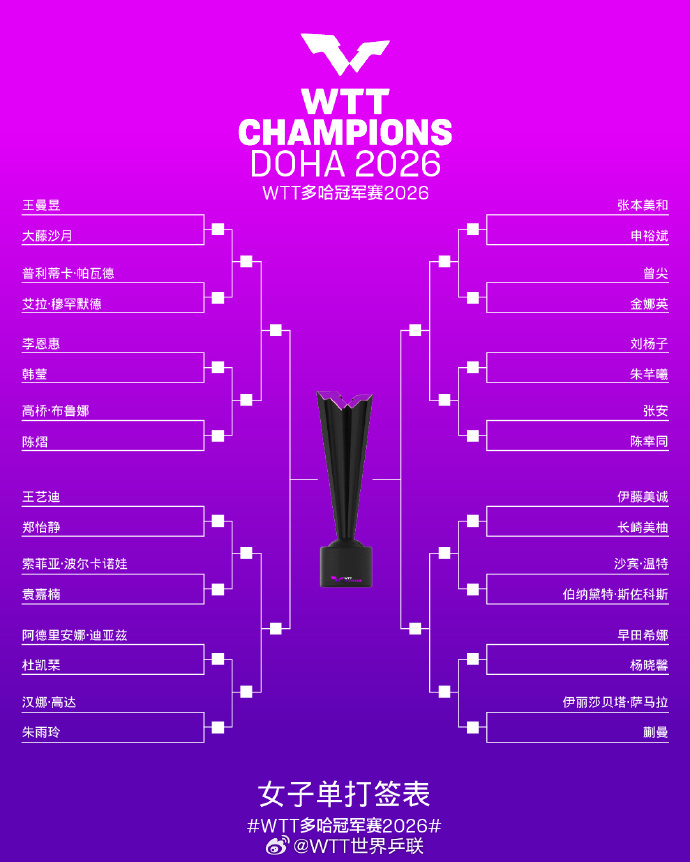 女單方面,王曼昱首輪將對陣大藤沙月,半區避開張本美和等強敵;張本美和、申裕斌首輪即對戰。
