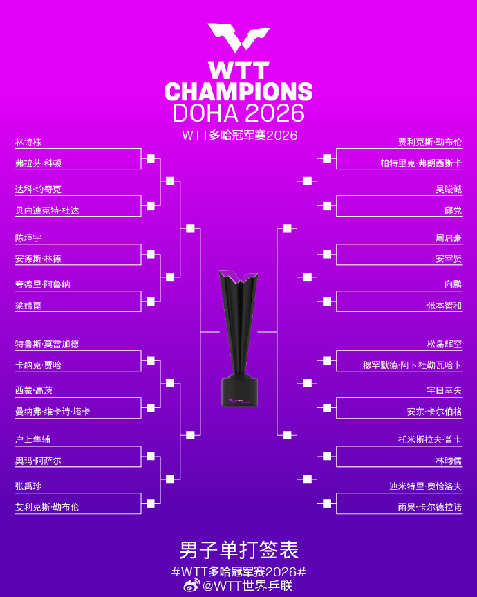 男單方面,林詩棟、梁靖崑、陳垣宇同在1/4區;向鵬首輪將對陣張本智和。