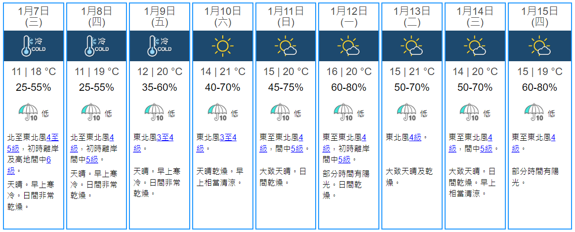 天文台表示,乾燥的冬季季候風正為廣東沿岸帶來晴朗的天氣。正午時分,本港各區氣溫較昨日(5日)低5至7度。本港地區下午及今晚天氣預測天晴及乾燥,吹清勁北風,離岸及高地吹強風。