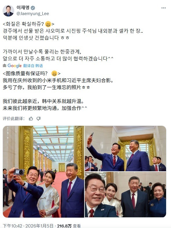 李在明在X賬號上寫道:「照片品質不錯吧?用我在慶州收到的小米手機和習近平主席夫婦拍的自拍照……多虧了你,我拍到了人生照片,哈哈。我們愈走愈近,韓中關係就愈好。未來我們將更頻繁地溝通,更緊密地合作。」