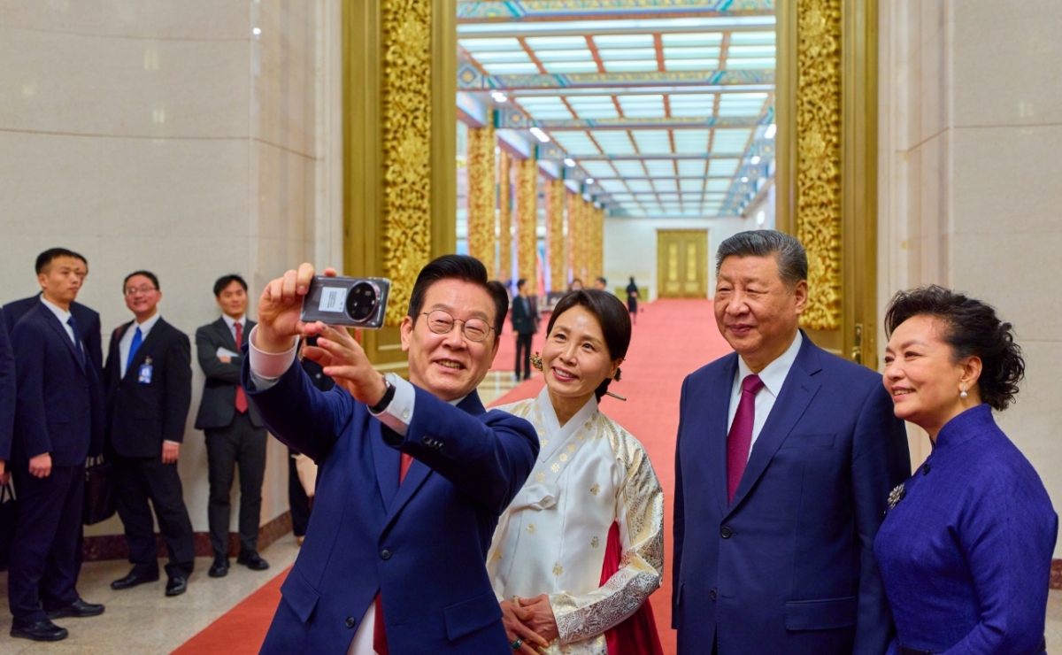 1月5日晚,習近平和彭麗媛在人民大會堂金色大廳為李在明夫婦舉行歡迎宴會。圖片顯示,李在明右手高舉小米15 Ultra與習近平合影,兩對夫婦又進行四人合影。