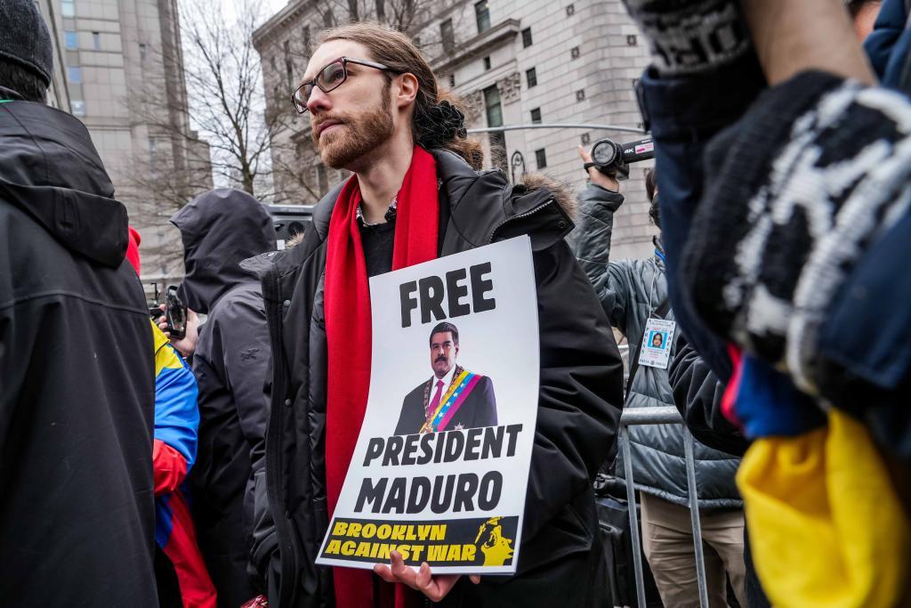 法院外,抗議者聚集,呼喊口號,要求釋放馬杜羅,抗議美國軍事干涉委內瑞拉。一些人舉着「釋放馬杜羅總統」「不要向委內瑞拉開戰」「停止對委內瑞拉的非法戰爭」等標語橫幅。