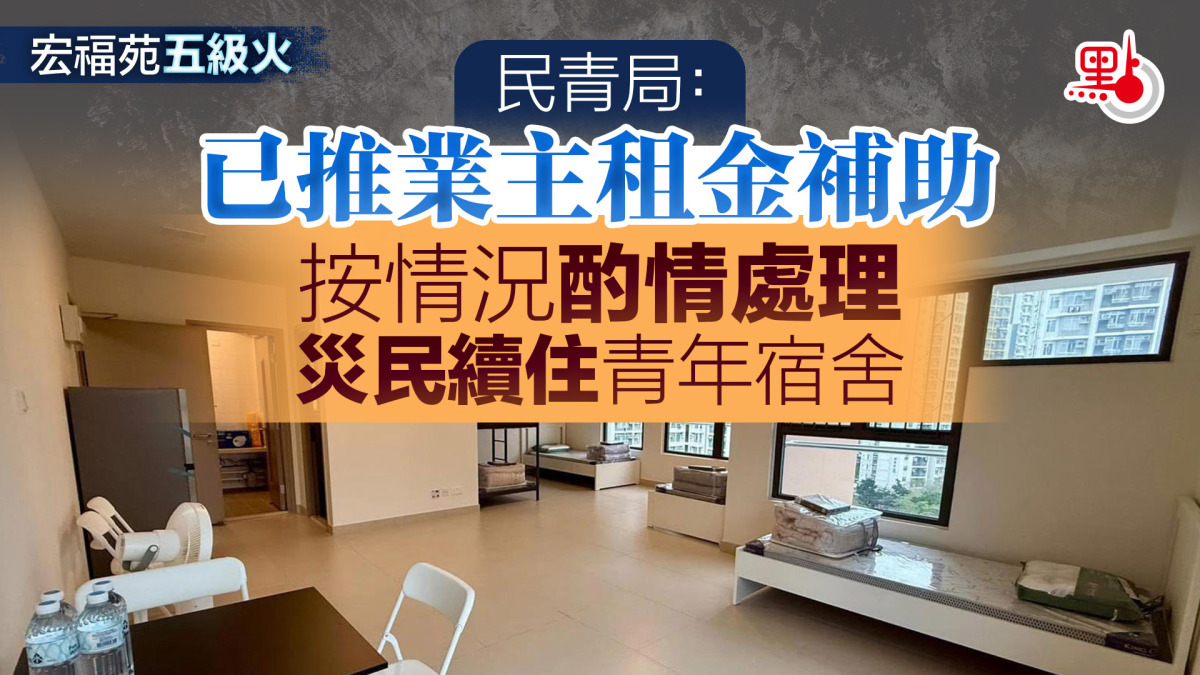 對於有報道引述入住青年宿舍兩個多星期的宏福苑居民稱,接獲月內遷離令通知,即使願意交租亦不獲接納,民青局發言人表示,部分仍留在青年宿舍的宏福苑居民,如果在本月31日後未能及時遷往中期住宿居所,青年宿舍營運者將按實際情況酌情處理個案,並會聯同一戶一社工協助居民盡快過渡至中期住屋安排。