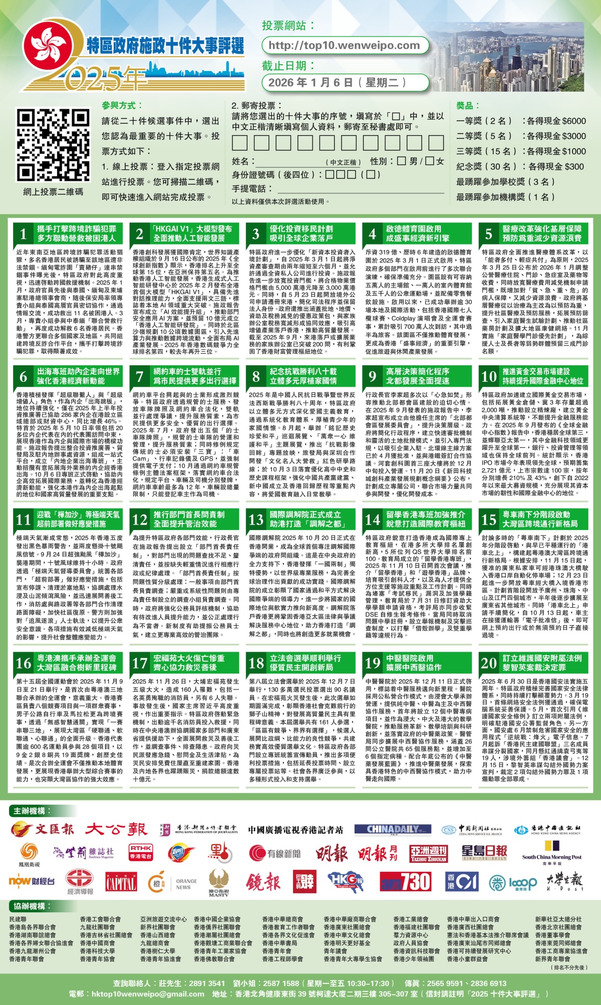 本次評選的參與方式快捷簡便,市民可瀏覽活動官方網站(https://top10.wenweipo.com)了解詳情並進行投票。為鼓勵廣泛參與,活動亦設有豐富獎品,共設一等獎(兩名)、二等獎(五名)、三等獎(十五名)、紀念獎(三十名)、「最踴躍參加學校獎」(三間)及「最踴躍參加機構獎」(一間)。參與者不僅有機會獲獎,更有望獲邀出席頒獎典禮,與社會賢達交流。