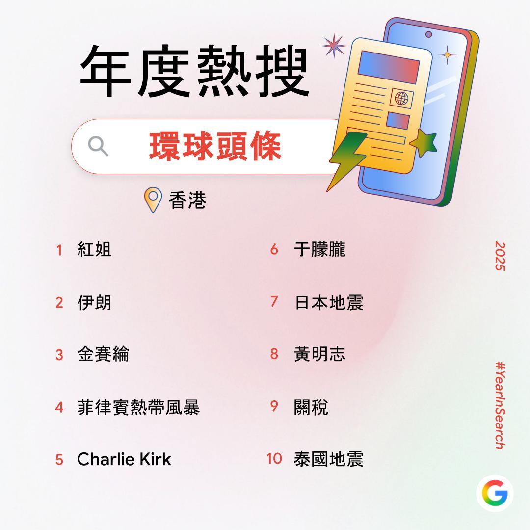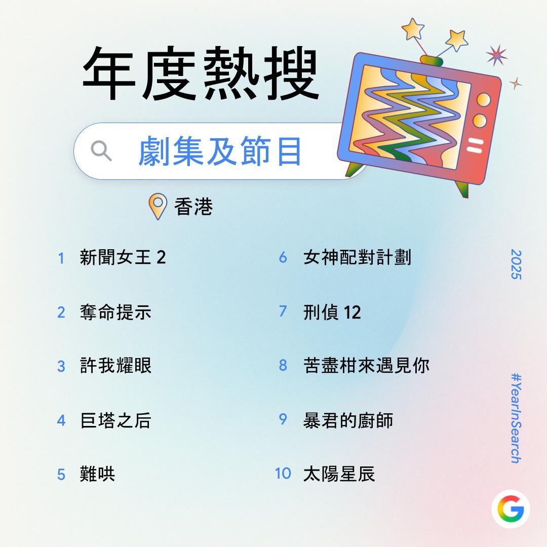 【點新聞報道】過去一年,你在網上搜索了什麼?Google香港今日(6日)公布2025年度搜尋榜,彙整去年搜尋量飆升得最高的關鍵字,透過數據回顧2025年港人關注的話題。搜尋榜共有14份榜單,涵蓋詞彙、時事、人物、娛樂及休閒範疇。