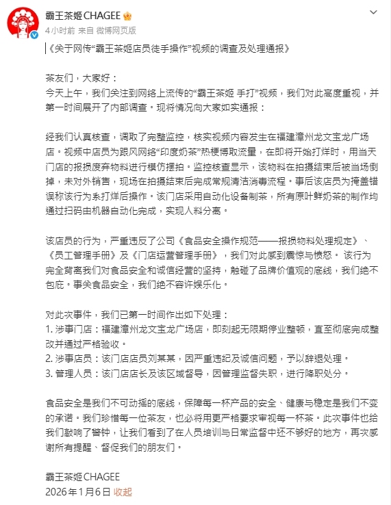 霸王茶姬發布的聲明顯示,經認真核查,調取完整監控,核實視頻內容發生在福建漳州龍文寶龍廣場店。視頻中店員為跟風網絡「印度奶茶」熱梗博取流量,在即將打烊時,用當天門店的報損廢棄物料進行模仿擺拍。監控核查顯示,該物料在拍攝結束後被當場倒掉,未對外銷售,現場在拍攝結束後完成常規清潔消毒流程。事後該店員為掩蓋錯誤,稱該行為系打烊後操作。該門店採用自動化設備製茶,所有原葉鮮奶茶的製作均通過掃碼由機器自動化完成,實現人料分離。
