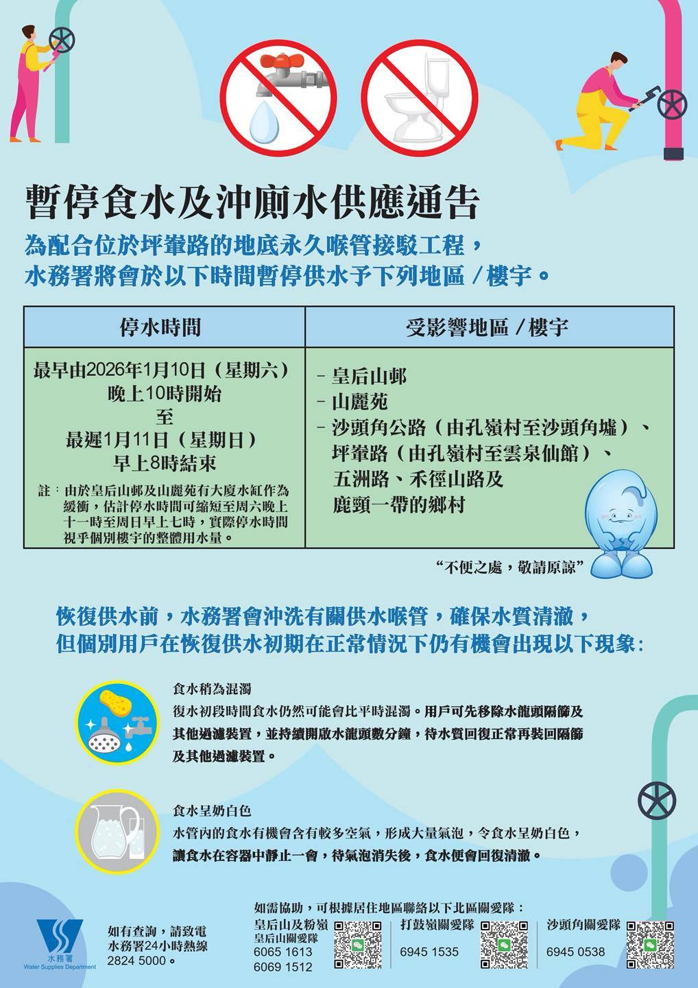 水務署指出,接駁工程在上述時段進行期間,上址一帶住戶的食水及沖廁水供應需要暫停,預計停水時間由1月10日晚上10時至翌日早上8時,受影響地區包括皇后山邨、山麗苑及位於沙頭角公路(由孔嶺村至沙頭角墟)、坪輋路(由孔嶺村至雲泉仙館)、五洲路、禾徑山路及鹿頸一帶的68條鄉村。由於皇后山邨及山麗苑有大廈水缸作為緩衝,估計該兩屋苑實際停水時間可縮短為1月10日晚上11時至翌日早上7時。