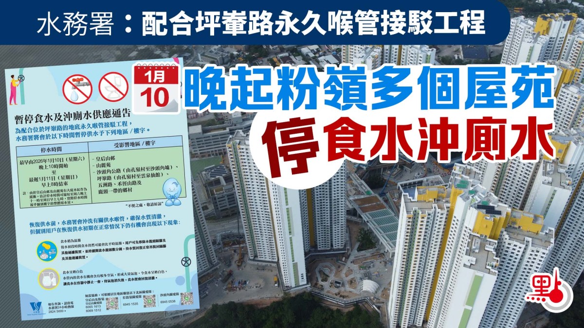 【點新聞報道】粉嶺皇后山邨等多個屋苑的食水去年出現瀝青,引起社會對水管情況的關注。水務署今日(1月6日)在社交專頁發文表示,去年在短時間內以臨時喉管取代坪輋路一段地下瀝青保護層鋼管,但由於該臨時喉管外露並佔用部分路面,水務署仍需在該處地底敷設新的永久喉管,有關永久喉管的敷設工程現已完成,並將於1月10日晚至1月11日早上將該喉管接駁至現有供水網絡。