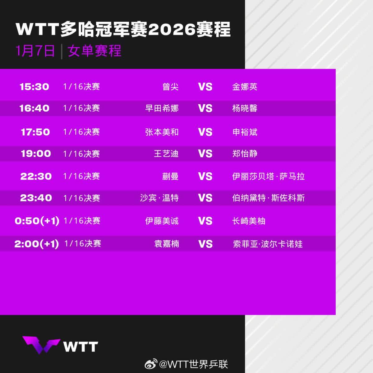 2026年WTT多哈冠軍賽將於1月7日至11日在卡塔爾多哈盧賽爾體育館舉行,男女單打各32名選手展開爭奪。由於孫穎莎、王楚欽因傷病需要休整,衝冠的擔子便落在王曼昱、林詩棟等人肩上。