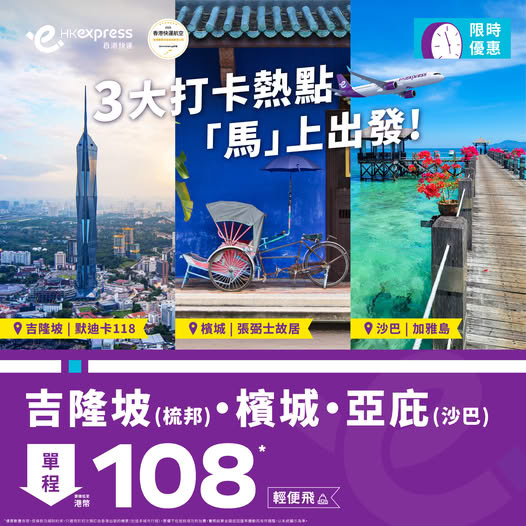 【點新聞報道】香港快運(HK Express)今日(7日)推出一日快閃優惠,馬來西亞吉隆坡(梳邦)、亞庇(沙巴)、檳城三大航點「輕便飛」單程票價低至$108。