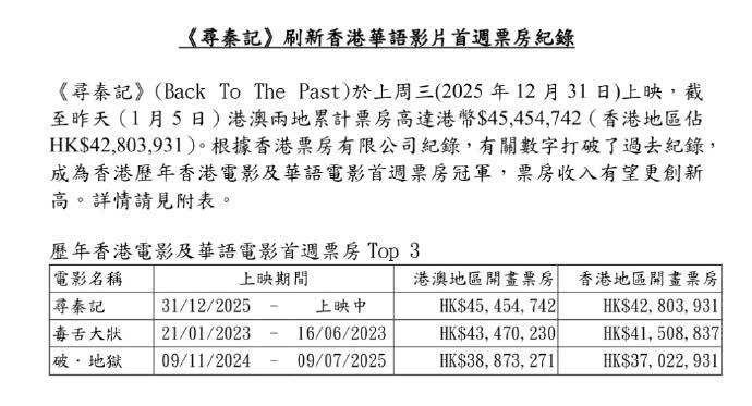 截至前天(1月5日),港澳兩地累計票房高達港幣$45,454,742,創下香港電影首周票房紀錄。