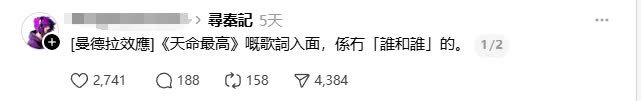 還有網友熱議,《天命最高》驚現曼德拉效應——原來歌詞的第一句並不是「誰和誰」,也沒有任何一段出現「誰和誰」。