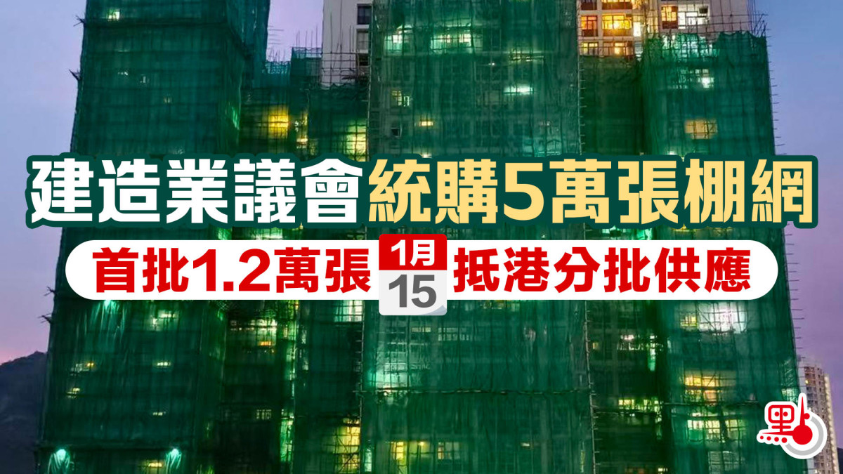 建造業議會今日(7日)與業界舉行閉門會議。會後,建造業議會執行總監鄭定寕向記者透露,上月尾已向廣東省兩家供貨商提交有關棚網訂單,包含測試費等雜費後,每張價格約為170港元,總採購5萬張棚網,數量料可覆蓋受「下架令」影響的420棟樓宇。首批1.2萬張棚網可望於下周四(15日)抵港,將分批優先供應予工程即將完成、需求較迫切的承建商。
