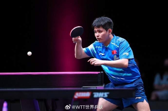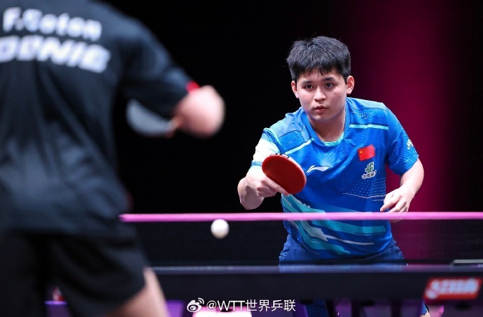 男單1/16決賽中,林詩棟3∶0法國小將科頓,局分11∶3,12∶10,11∶2。