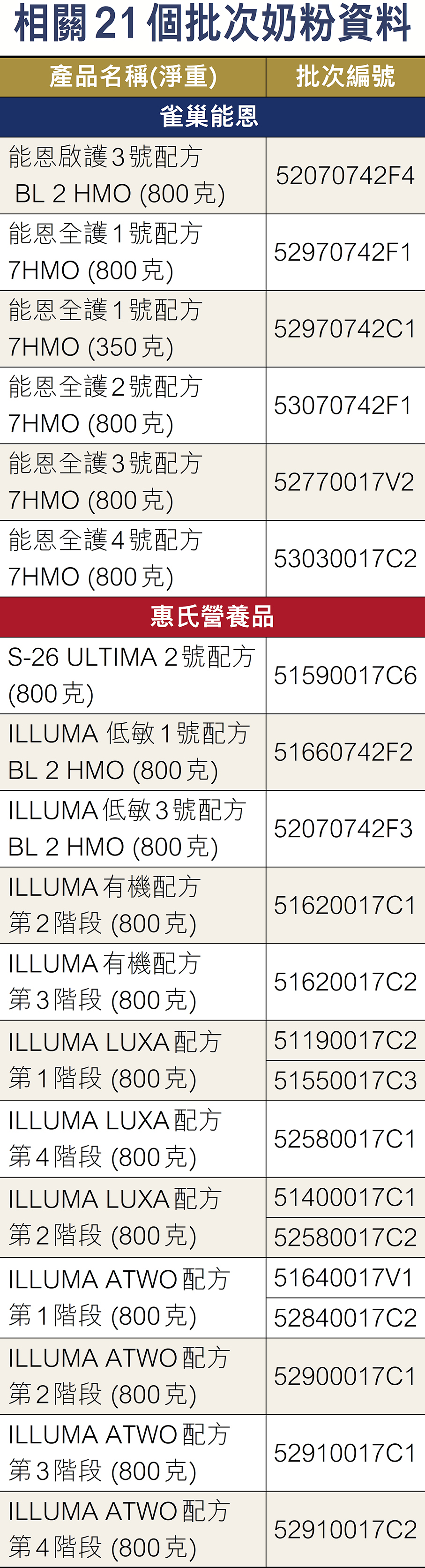 根據雀巢香港最新資料,進口本港的嬰幼兒配方奶粉有21個批次亦可能曾使用相關原材料,涉及雀巢能恩的6個批次嬰幼兒配方奶粉,以及15個批次奶粉來自雀巢旗下的惠氏營養品(見表)。