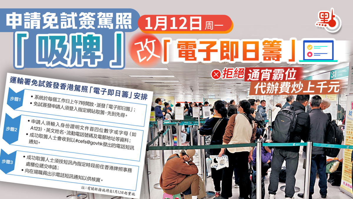 金鐘運輸署牌照事務處排隊黨亂象愈演愈烈,香港文匯報昨日(1月7日)頭版獨家調查報道《「吸牌」排隊黨肆虐 每天「招兵」斂財25萬》見報後,特區政府運輸署昨日下午迅速宣布,由下周一(12日)起,金鐘統一中心的香港牌照事務處將對申請免試簽發香港正式駕駛執照(俗稱「吸牌」)實施「電子即日籌」安排,全面取代現場派籌,以應付與日俱增的需求,並確保真正有需要的市民能公平有序地使用服務。同時,運輸署正與數字政策辦公室合作,優化現有網上預約系統,長遠而言會積極研究引入人工智能(AI)技術處理申請程序,讓服務更便捷高效。