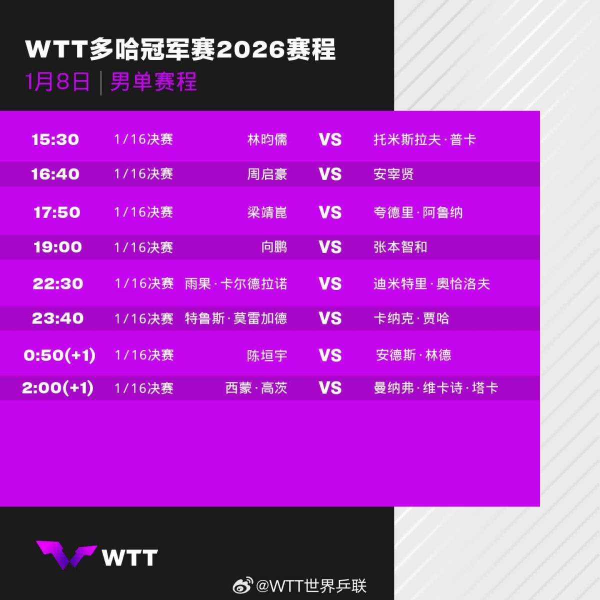【點新聞報道】2026年WTT多哈冠軍賽迎來第二日對決,國乒今日(8日)派出7人出戰,繼續爭奪男、女單16強名額。當中,國乒選手向鵬對決張本智和、王曼昱迎戰大藤沙月等中日焦點戰值得關注。港隊方面,杜凱琹將迎戰波多黎各選手迪亞茲,力晉女單16強。