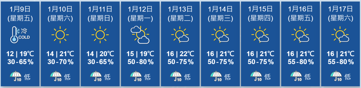 另外,受乾燥的冬季季候風影響,天文台預測,明日(9日)廣東普遍晴朗,早上寒冷。隨着季候風在周末稍為緩和,華南氣溫略為回升,但早上仍然清涼。預料一股偏東氣流會在下周初影響華南沿岸,該區風勢頗大。而乾燥的東北季候風會在下周中後期為廣東沿岸帶來大致晴朗的天氣。