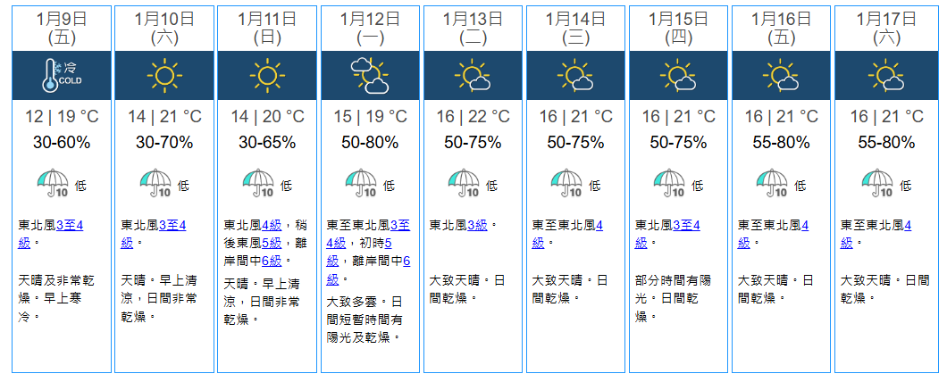 天文台指,冬季季候風正為廣東沿岸帶來非常乾燥及晴朗的天氣。截至下午4時,天文台錄得的相對濕度曾下降至17%,是天文台總部自1984年設置自動氣象站以來一月份的最低紀錄。由於今晚風勢更弱,輻射冷卻會尤其明顯,明早新界部分地區氣溫顯著較低。根據天文台九天天氣預報,明早寒冷,市區最低氣溫約12度,新界部分地區氣溫顯著較低,日間最高氣溫約19度。展望周末期間氣溫稍為回升,非常乾燥,但早上天氣清涼;下周一(1月12日)風勢頗大,短暫時間有陽光;下周中期日間和暖。