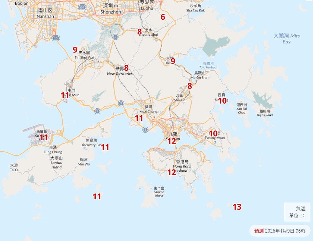 天文台自動分區天氣預報則顯示,明早沙田、大埔、天水圍、石崗、上水等地區最低氣溫跌至10度以下,打鼓嶺一帶更凍至只有6度。