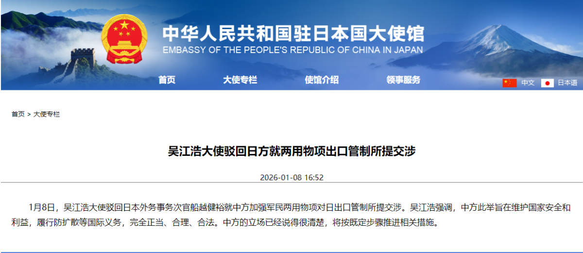 【點新聞報道】據中國駐日本大使館消息,1月8日,中國駐日本大使吳江浩駁回日本外務事務次官船越健裕就中方加強軍民兩用物項對日出口管制所提交涉。